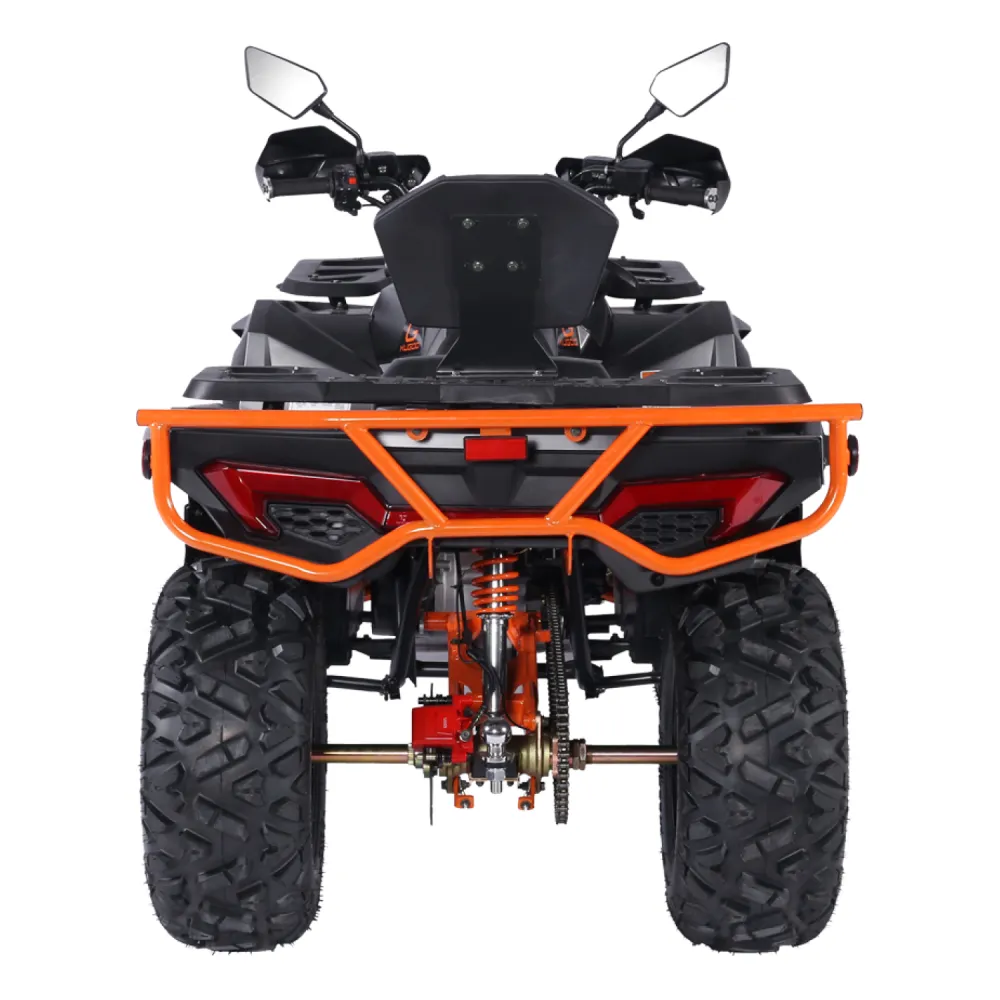 Под капотом Kugoo K5 скрывается производительный бензиновый двигатель объёмом 300 куб. см, выдающий 13,5 кВт мощности и 22 Нм крутящего момента. Это позволяет квадроциклу уверенно разгоняться, преодолевать сложные участки и сохранять стабильную тягу даже на крутых подъёмах до 15 градусов.
