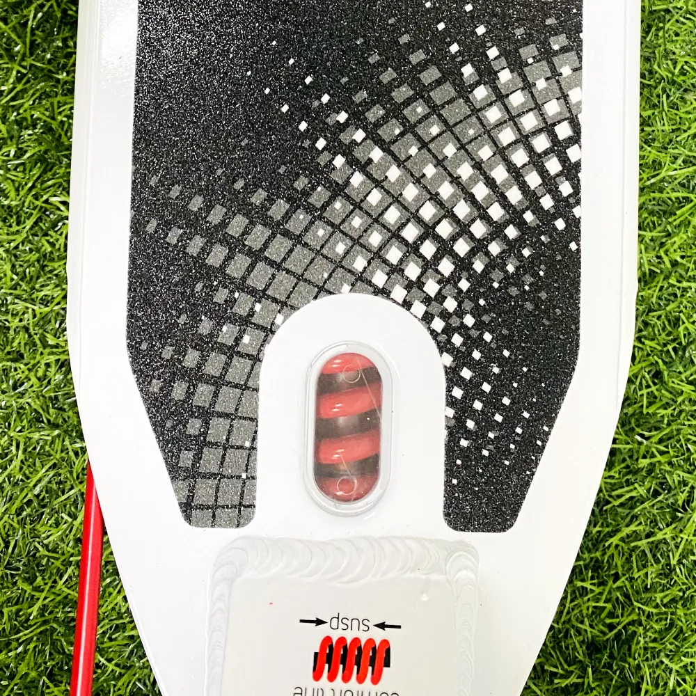 Широкую деку, изготовленную из прочного облегченного алюминия (ширина – 13,6 см длина – 46 см). Рабочая часть поверхности покрыта специальным материалом, не допускающего случайного соскальзывания ног, минимизируящая иск падения ездока.