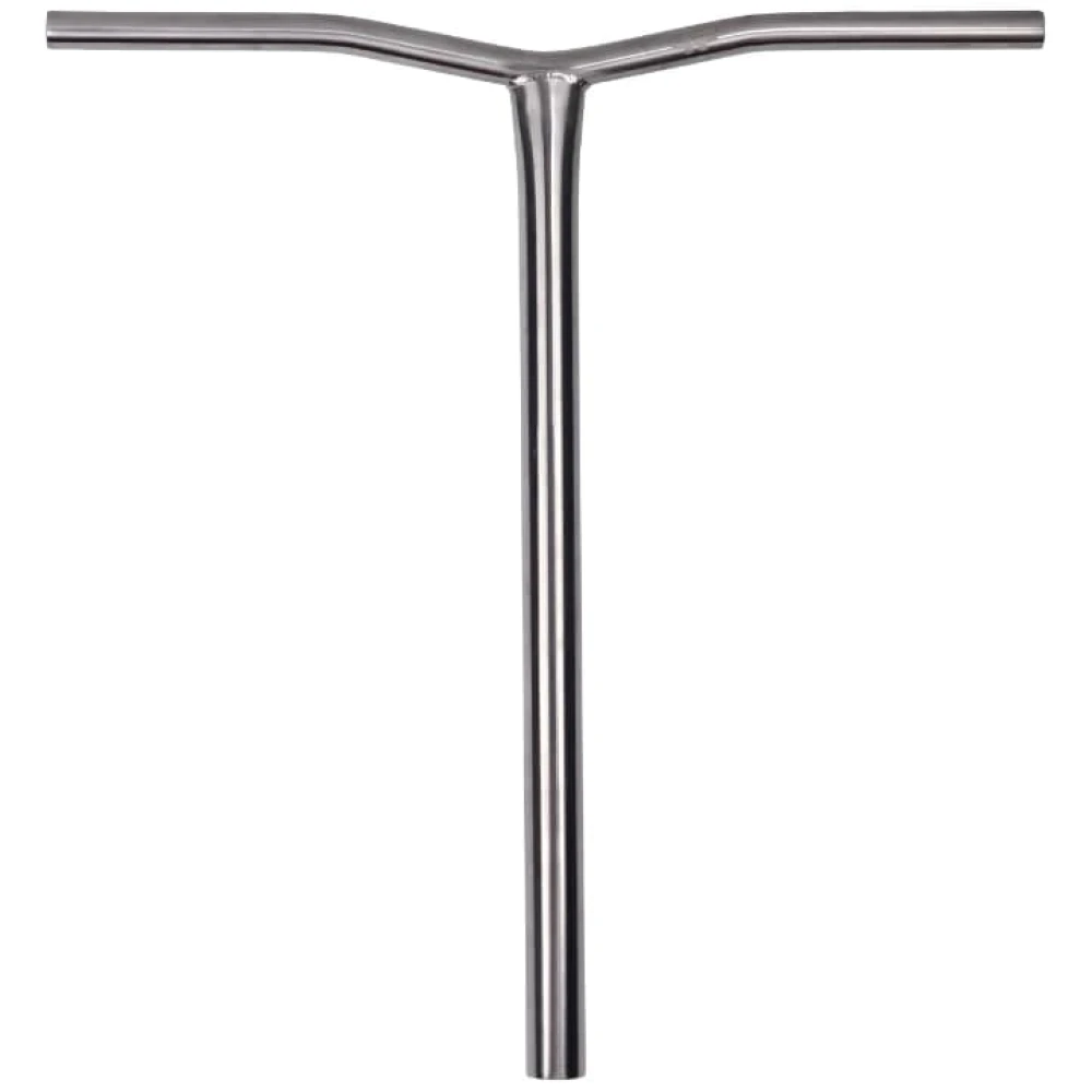 Руль титановый 580х625  Облегченный вариант важной детали самоката имеет небольшой вес (до 1кг). Хромированный вариант руля выглядит модно и эстетично. Т-образная форма впечатляет удобством и комфортом пользования. Элемент самоката изготовлен из прочного долговечного материала, имеет запас прочности. Технические характеристики допускают выполнение рискованных трюков и маневрирование. При этом первоначальные характеристики руля остаются без изменений. Чтобы купить руль титановый по приемлемой стоимости предлагаем связаться с менеджером интернет-магазина. Также в каталоге имеются другие полезные для райдера категории.